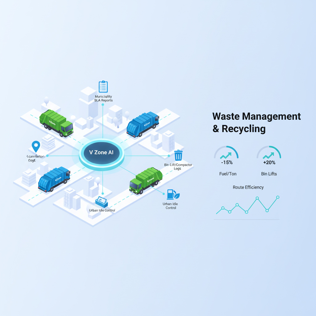 V Zone empowers waste management and recycling fleets with real-time tracking, route optimization, environmental compliance, and AI-based efficiency insights — transforming how cities handle waste.
